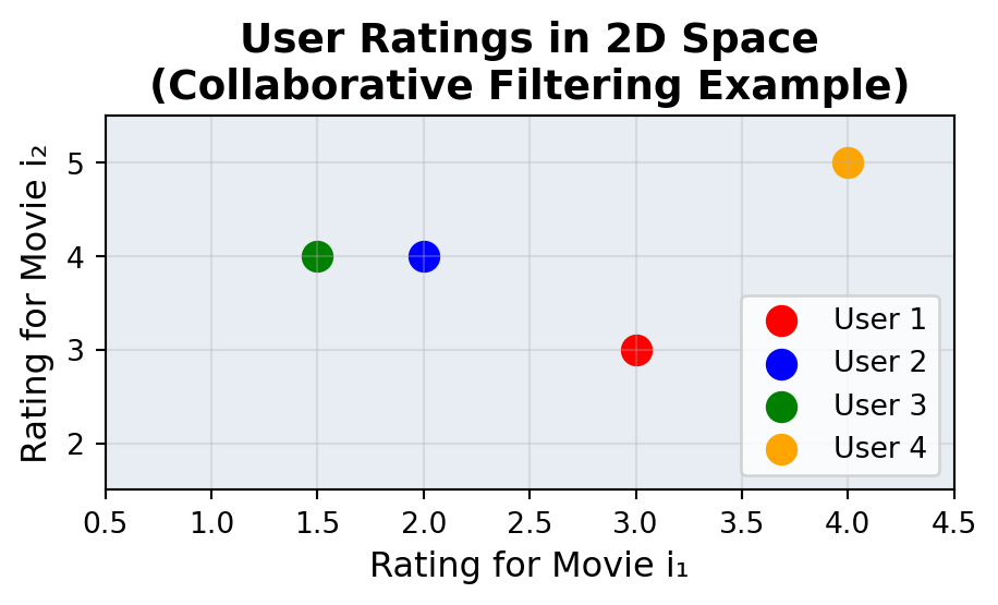 For example, there are 4 user \(u_1, u_2, u_3, u_4\)\(\in \mathbf{U}\) have rated two movies \(i_1, i_2\)\(\in \mathbf{I}\) as follows: