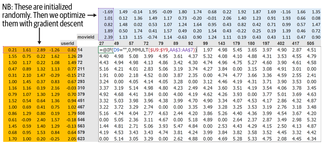To calculate the result of each user-item interaction, we look for the index of the item in the item latent factor matrix and the index of user in the user latent factor matrix. Then, we perform the dot product between the latent vectors.